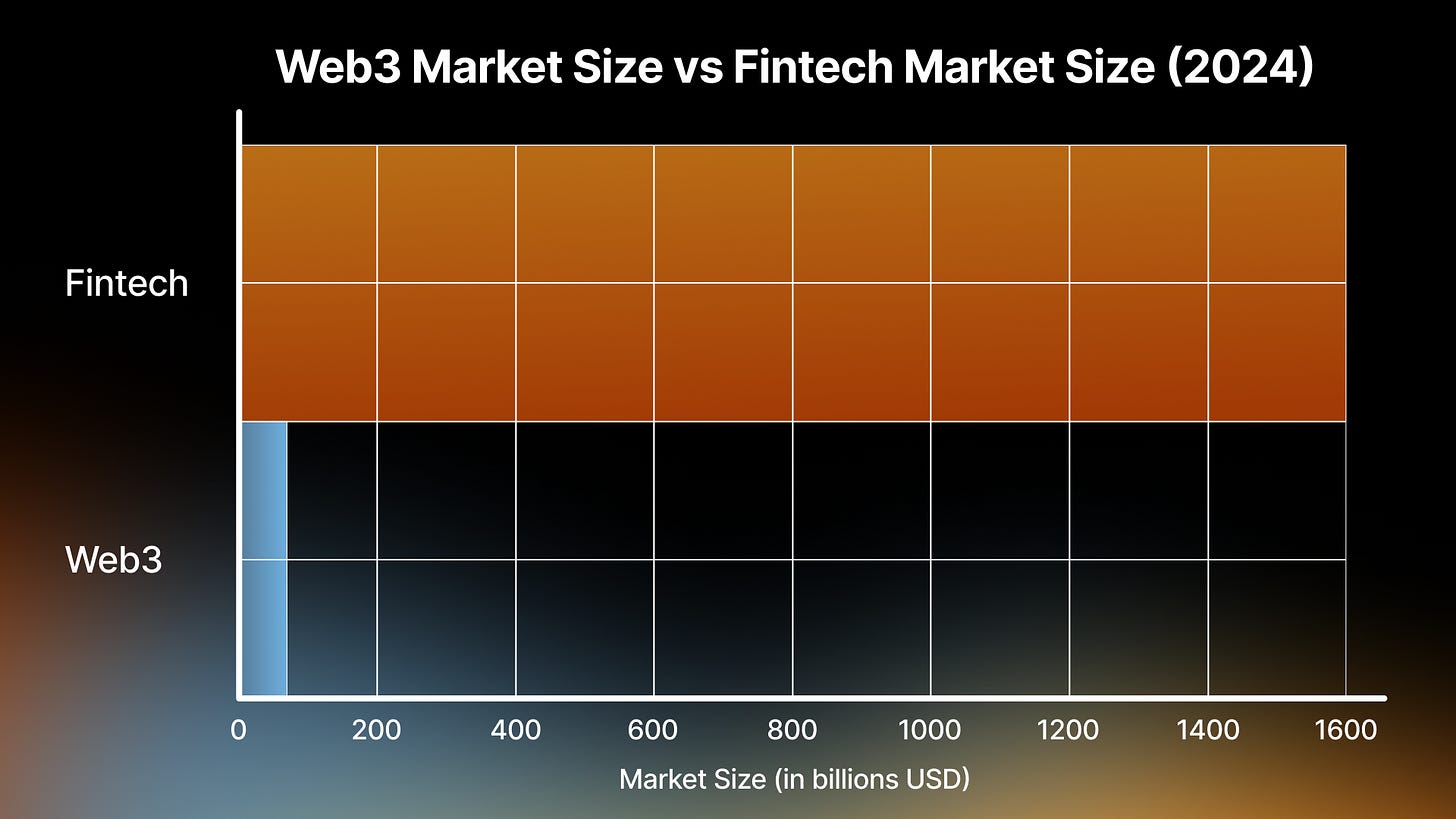 Here’s a comparison: the Web3 market is estimated at around $33 billion in 2024, while the Fintech market is a whopping $1.65 trillion. The graph makes the size difference pretty obvious.